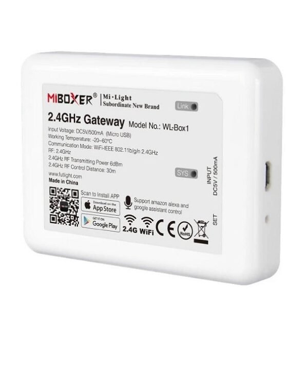 The MiBoxer WL-BOX1 WiFi Gateway is a dedicated lighting control hub designed specifically to connect MiBoxer / Mi-Light 2.4GHz RF LED controllers to your home WiFi network.